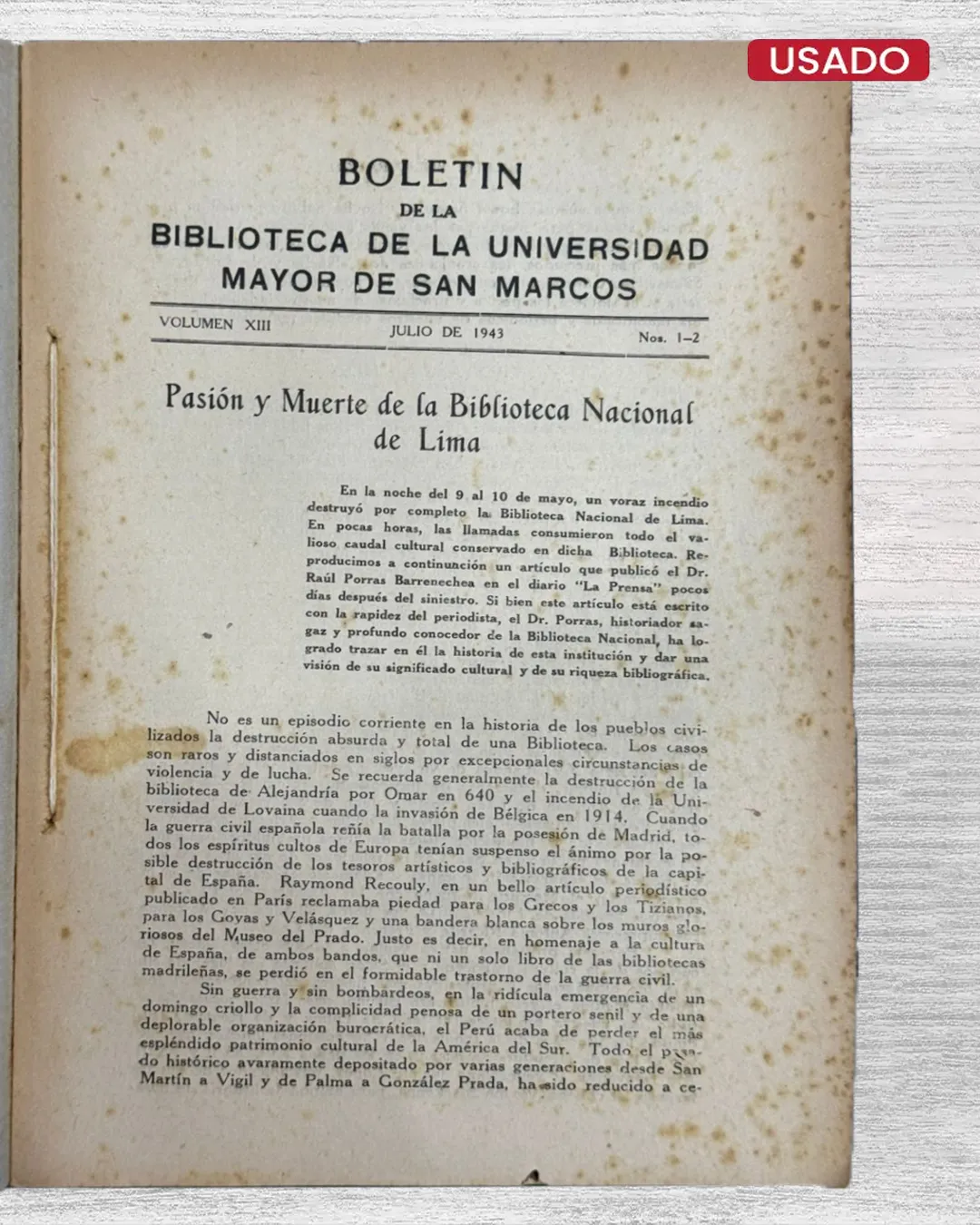Desentrañe el pulso intelectual limeño de 1943 en “BOLETÍN BIBLIOGRÁFICO. PUBLICADO POR LA BIBLIOTECA CENTRAL DE LA UNIVERSIDAD MAYOR DE SAN MARCOS DE LIMA – AÑO XVI – NOS. 1-2 (JULIO, 1943)”, dirigido por José M. Valega. Este doble número del Año XVI, emanado de la venerable Biblioteca Central de San Marcos, compila reseñas exhaustivas, novedades editoriales y catálogos de adquisiciones, reflejando el fervor académico en tiempos de guerra mundial.
