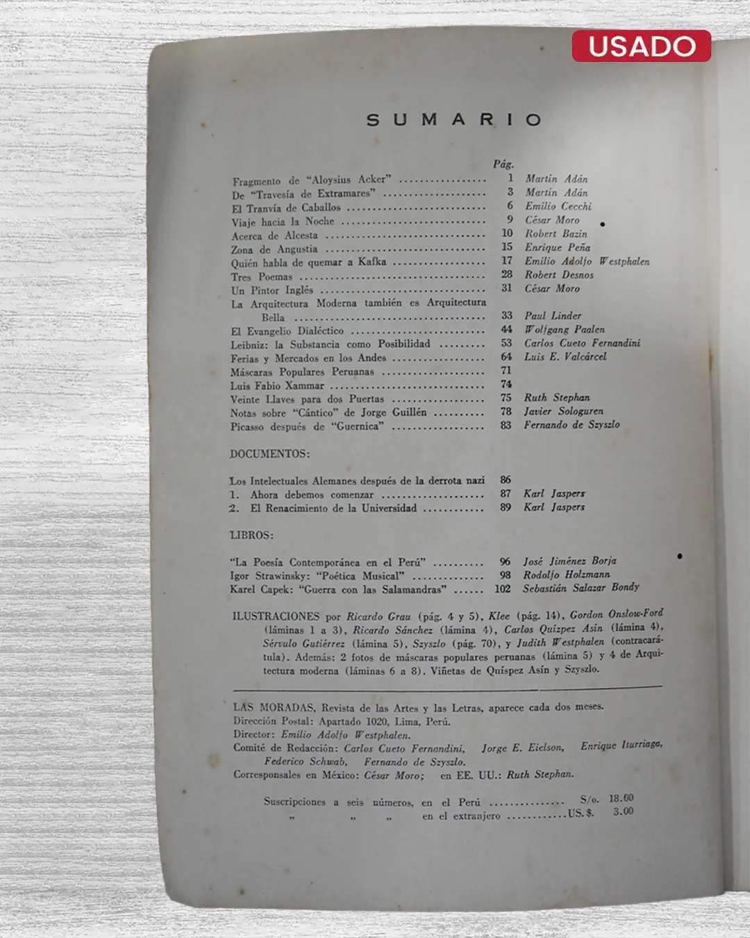 Adéntrese en "LAS MORADAS. REVISTA DE LAS ARTES Y LAS LETRAS. VOL. I – Nº 1 (MAYO DE 1947)", publicación inaugural de varios autores que captura el fervor intelectual del Perú inmediato posbélico. Este número fundacional reúne manifiestos literarios, críticas pictóricas y ensayos filosóficos que dialogan con vanguardias europeas y criollismo andino, reflejando el tránsito de la generación del 40 hacia horizontes cosmopolitas. Páginas vibrantes albergan poemas de corte existencialista, reseñas de exposiciones limeñas y debates sobre el rol del arte ante la Guerra Fría incipiente. Su diseño tipográfico innovador —con ilustraciones xilográficas y tipogramas experimentales— anticipa la efervescencia de talleres gráficos cusqueños.