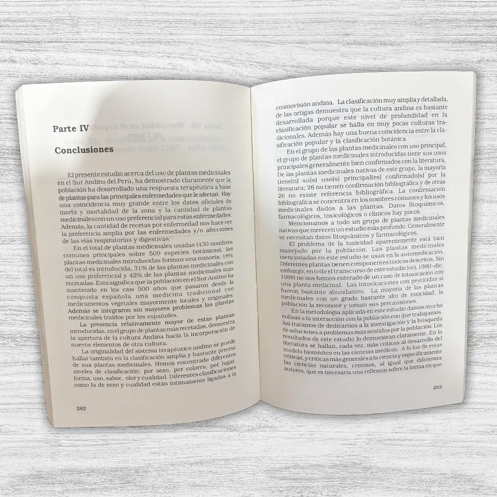 PLANTAS MEDICINALES EN EL SUR ANDINO DEL PERÚ de C. Roersch es un estudio etnobotánico fundamental que documenta la sabiduría ancestral sobre el uso curativo de las plantas en comunidades andinas del sur del Perú. Fruto de una profunda investigación realizada entre 1981 y 1988, la obra describe más de cien especies vegetales utilizadas en la medicina tradicional, combinando criterios científicos con la riqueza del conocimiento popular. Este diálogo entre saberes ofrece una mirada integral sobre cómo las poblaciones altoandinas han desarrollado complejos sistemas de salud basados en su entorno natural.